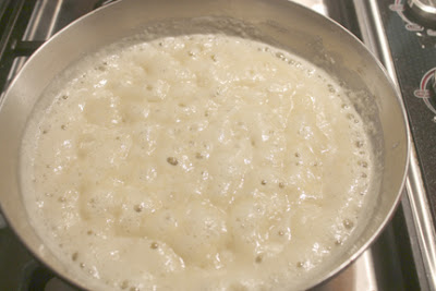 For a white sauce, you do not want to brown the roux. When it's bubbly as shown in the picture, add 2 cups of milk all at once while stirring until it comes back to a boil and has thickened to a nice consistency.